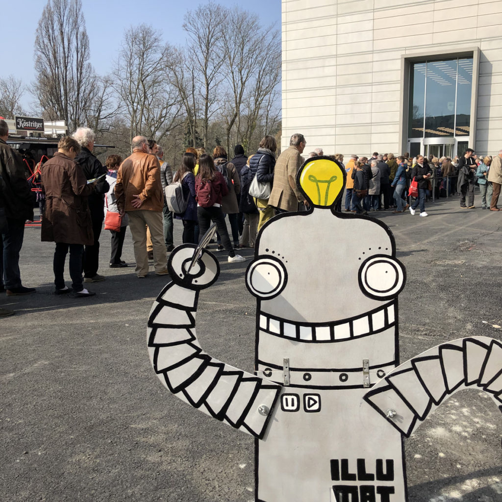 Bemerkenswert: Als Kasten vor dem Kasten in bester Gesellschaft mit unserem quadratischen Kubus, in dem es zeichnerisch rund geht und vor dem das Publikum vor Freude & Spannung im Dreieck springt! :)